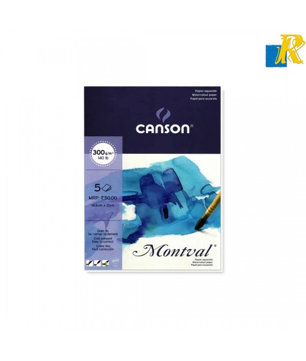 This pack includes 5 canson Montval cold pressed water colour paper sheets of size 148mm x 210mm. The paper sheets are 100% cellulose of 300g/m.