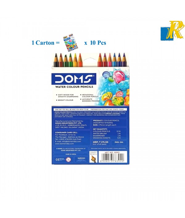 DOMS Hexagonal Pre-Sharpened Water Colour Pencils Free Watercolor Paper- Sharpener & Water Brush 12 Shades(Art No.8392)
