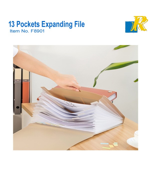 A 13-pocket expanding file is a portable, flexible file folder designed to organize and store documents in separate sections. It typically features: