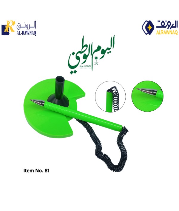 Green Plastic Table Ball Pen Stick On Base with Stretch Coil Holder Spring Attached Stand for Saudi National Day Item No.81